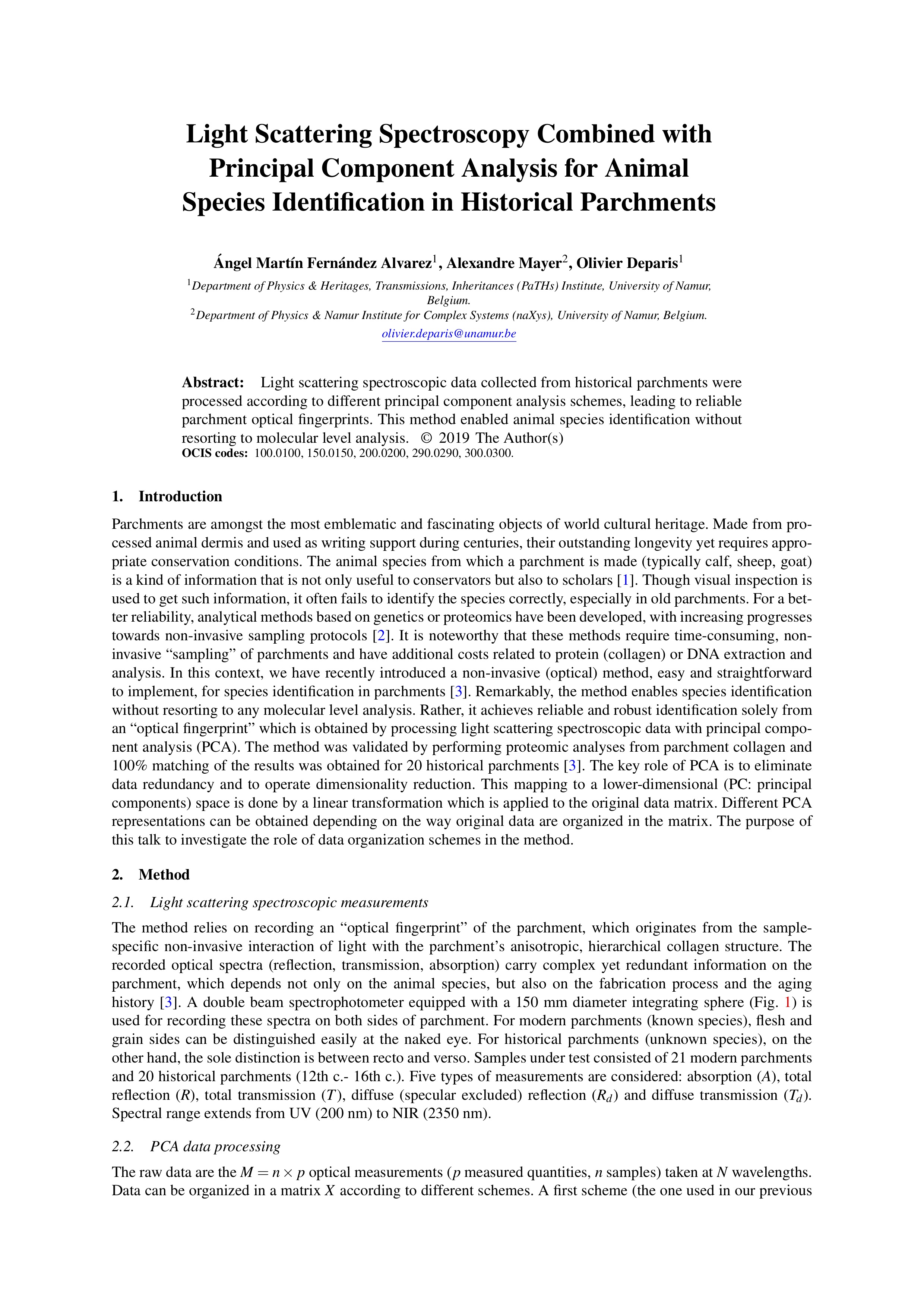 Conference: Olivier Deparis "Light Scattering Spectroscopy Combined with Principal Component Analysis for Animal Species Identification in Historical Parchments", OSA Novel Optical Materials and Applications, San Francisco, California, United States (29 Jul - 1 Aug 2019)