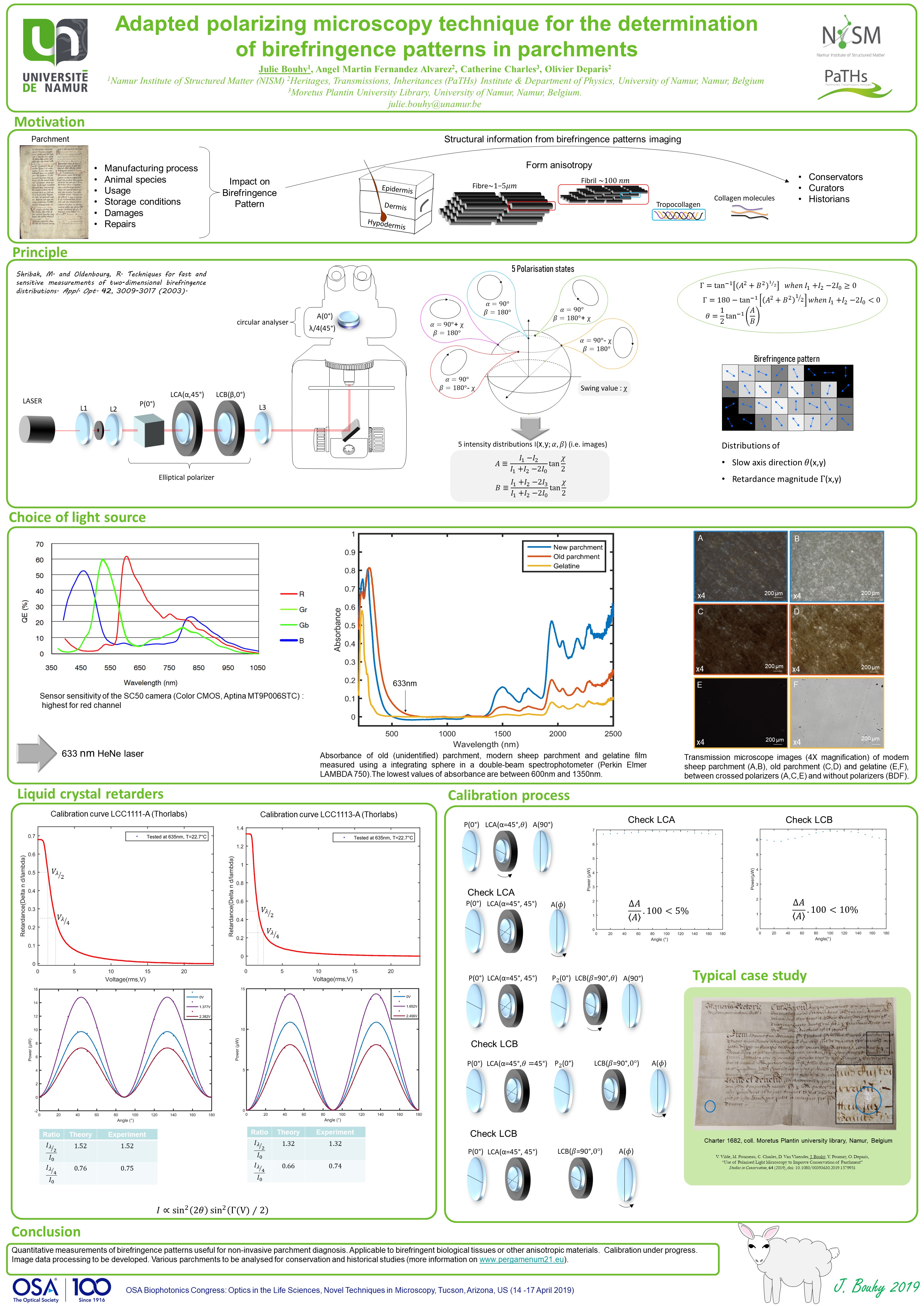 Poster: Julie Bouhy "Adapted polarizing microscopy technique for the determination of birefringence patterns in parchments", OSA Biophotonics Congress, Tucson, Arizona, USA (17-22 April 2019)